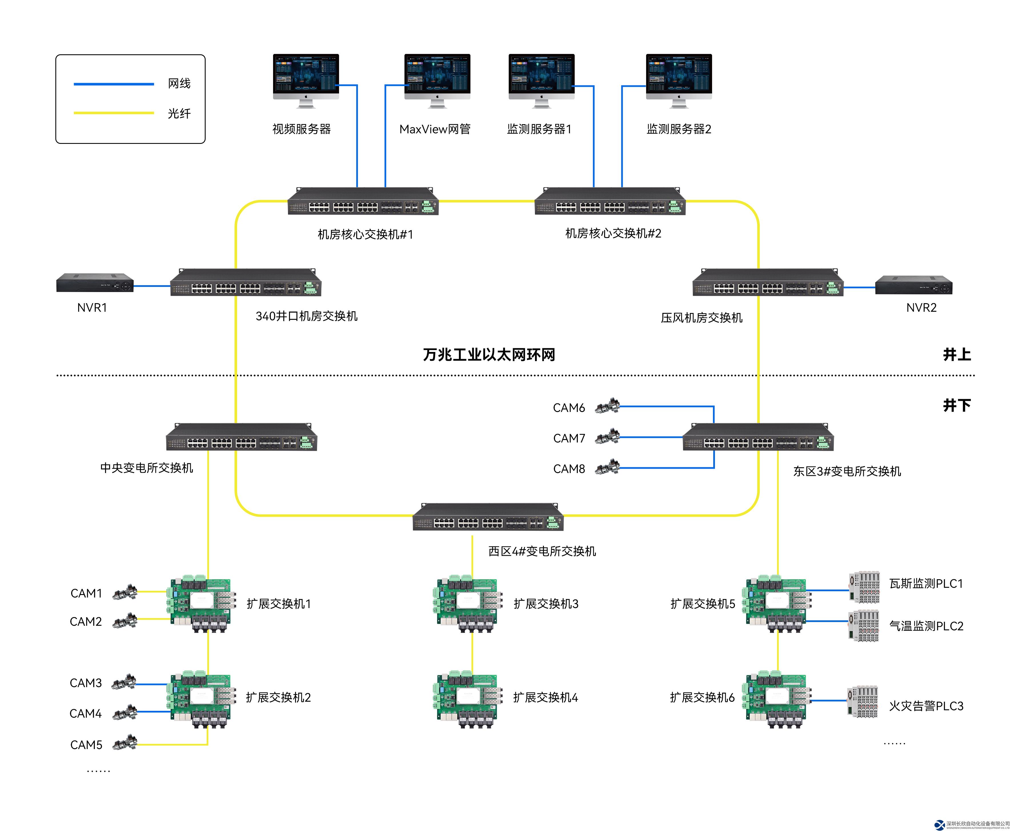 該方案在地面信息機房配置了兩臺三層網(wǎng)管萬兆交換機,作為整個環(huán)網(wǎng)的核心交換機。在地面通風機房和主井機房再分別安裝一臺萬兆環(huán)網(wǎng)交換機,通過萬兆光口與核心交換機的萬兆光口組成地面萬兆以太環(huán)網(wǎng)。在井下變電所,我們安裝了三臺井下環(huán)網(wǎng)交換機,通過萬兆端口和地面核心交換機形成井上下萬兆以太環(huán)網(wǎng),井下萬兆環(huán)網(wǎng)交換機通過千兆光口級聯(lián)千兆交換機進行數(shù)據(jù)口擴展。